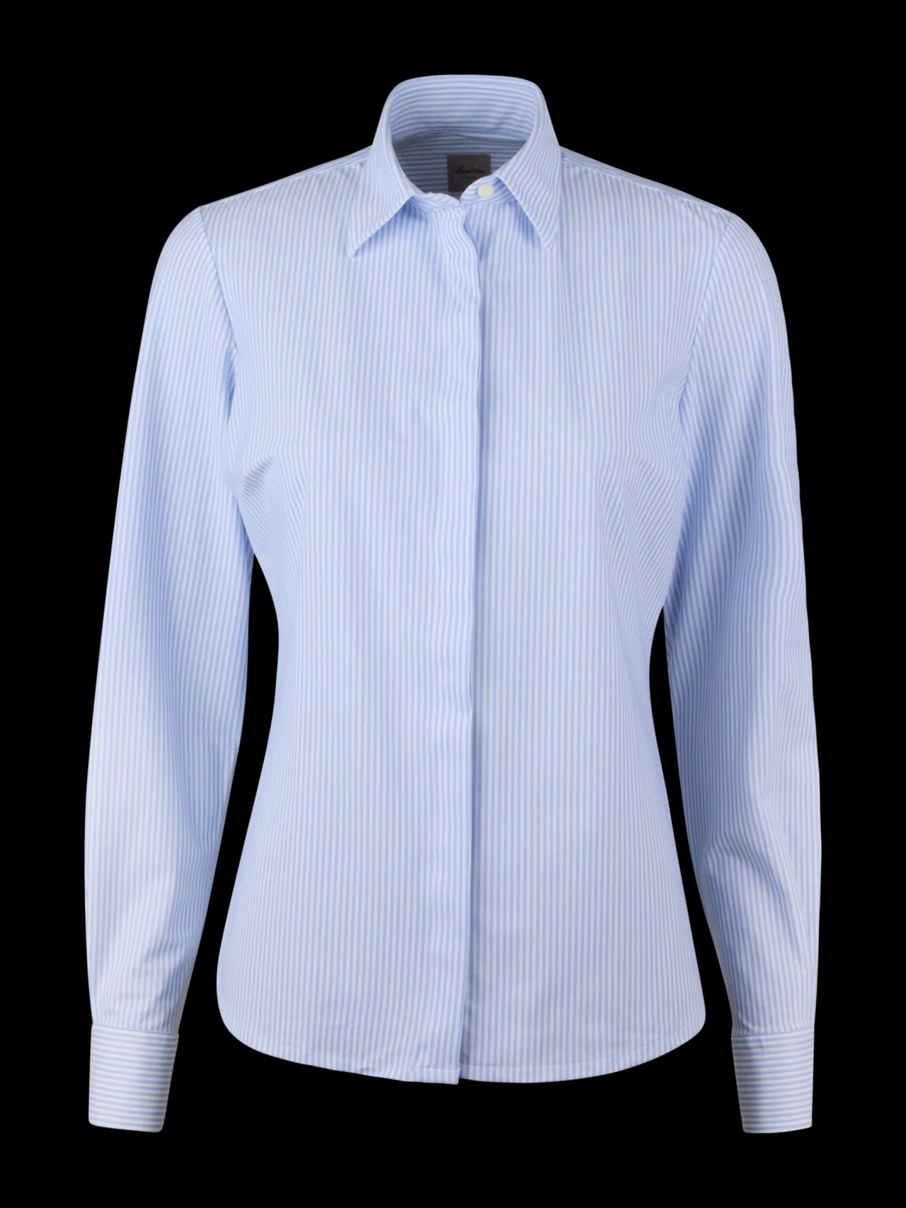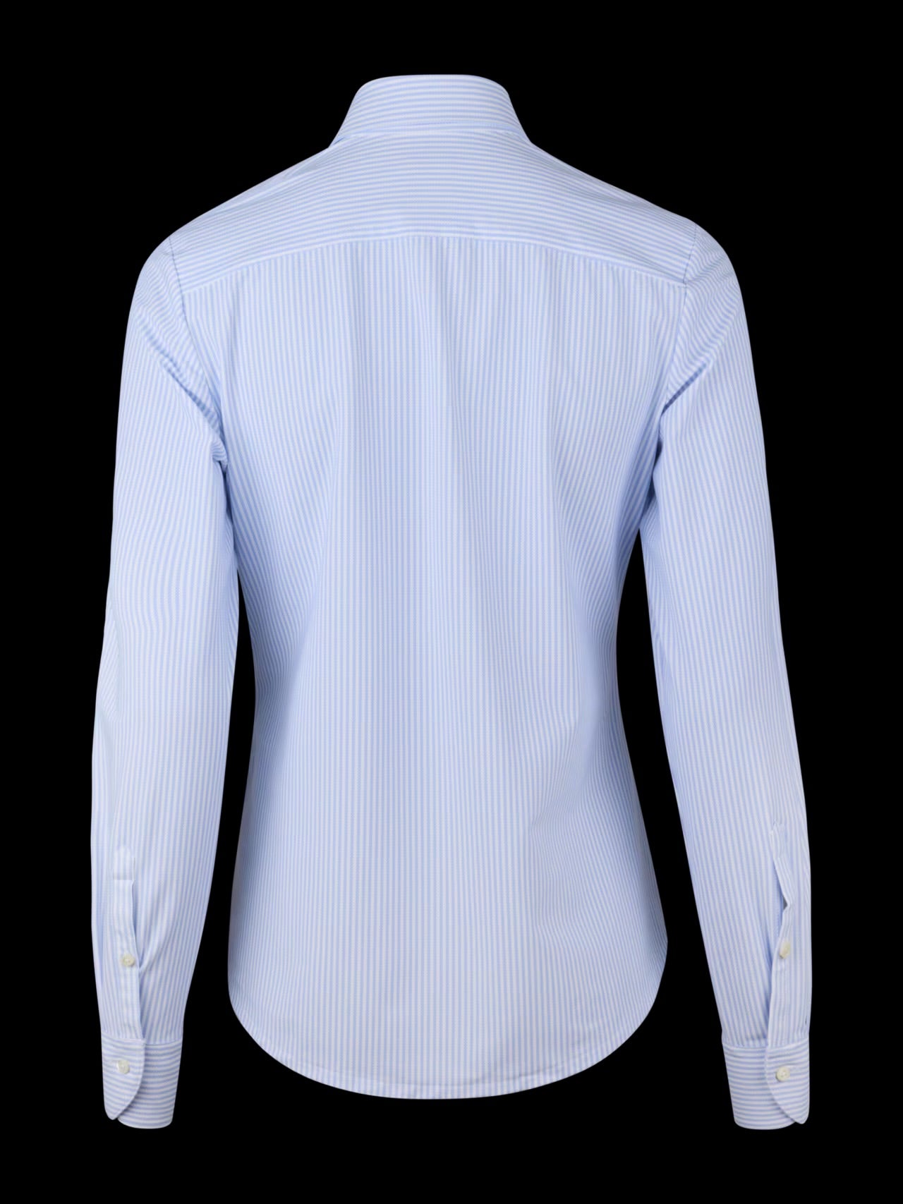 Denne stribede jerseyskjorte er fremstillet i polyamid og elastan og har en feminin pasform. Skjorten har perlemorsknapper, enkelte manchetter og en klassisk krave.