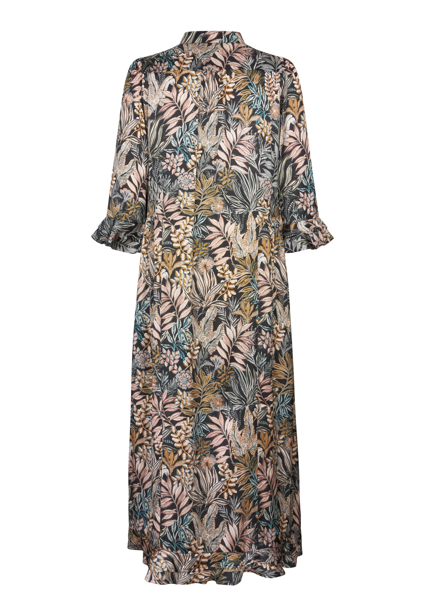 Smuk silkekjole med flæsedetaljer, skjult knaplukning og sidelommer. Kjolen er super behagelig med stretch i silken, og den kan sagtens bruges med en stor strik over på de køligere dage.